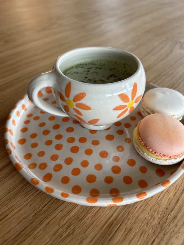 tasse boule à café / tournée au tour de potier / motif fleurs oranges /en grès blanc / émail transparent / contenance 100ml